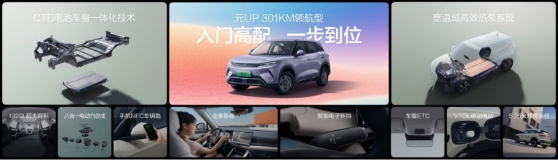 配置上,元UP 301KM领航型入门即高配,7.48万元即可获得像自动恒温空调、后排空调出风口等舒适配置;DiLink智能网联系统、智能语音交互系统等智能配置;智能上下电、VTOL移动电站等便利配置;全景影像、前排双安全气囊等安全配置。