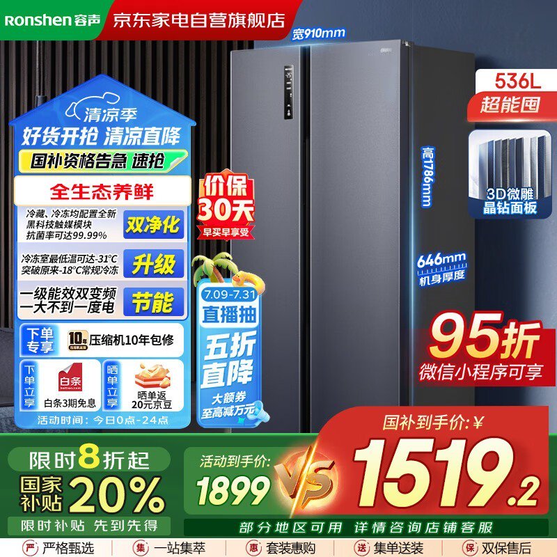 容声BCD - 532WD11HP冰箱京东促销,低至1519元