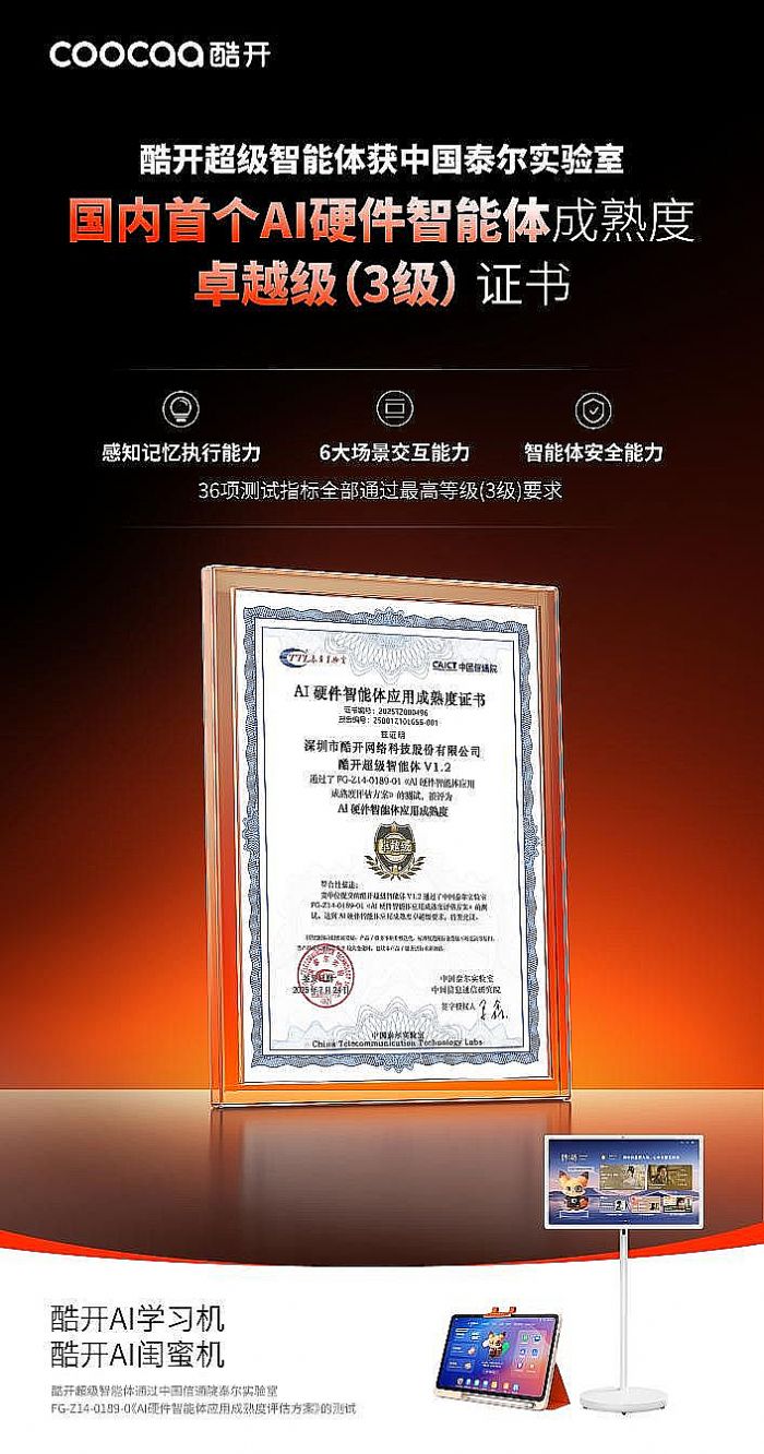 2025年7月30日,中国信息通信研究院泰尔实验室向深圳市酷开网络科技股份有限公司颁发首张《AI硬件智能体应用成熟度证书》。经36项指标的严格测试,酷开超级智能体V1.2基于全链路技术能力与多场景应用落地的卓越表现,成功通过泰尔实验室《AI硬件智能体应用成熟度评估方案》(FG-Z14-0189-01)的测试,获评“卓越级”(3级)。