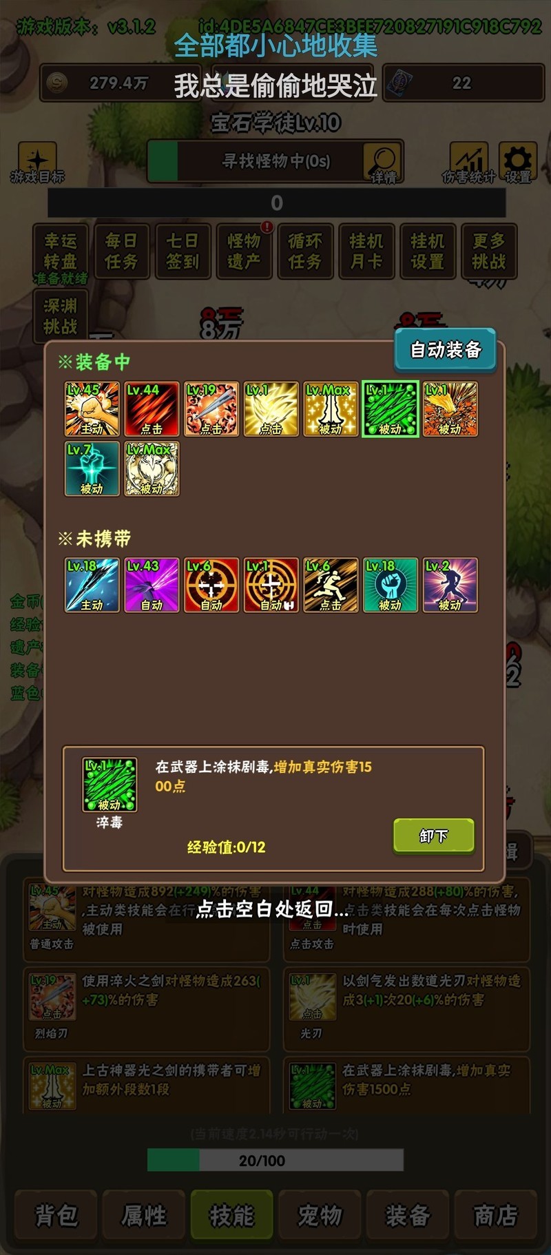 将刷怪药水保留至困难模式解锁自动挂机功能后再使用。前期优先购买潜能果以提升开局金币收益,但达到60级后应转为购买怪物血量和防御降低属性。在挂机设置中选择金币购买等级,并合理搭配技能组合,通过挂机快速刷取普通难度关卡,高效获取怪物遗产和兑换牌子。此时获得的遗产建议暂时保留,先不要进行高级转生,以避免频繁观看广告。同时别忘了向管理员领取十次转生奖励,获取第二瓶药水和彩色钻石。当积累的怪物遗产达到六万以上时,便可暂停刷图,当然若想继续提升也未尝不可。