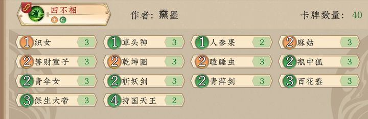 核心卡牌为保生大帝,因四不相技能需弃牌,草头神主要用于变身为保生大帝,提升容错率,同时可变青伞女与百花羞作为补充。