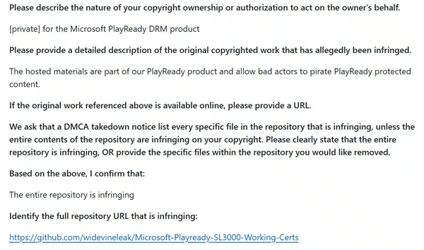 微软在通知中指出,这些泄露的材料属于PlayReady产品,可能会被不法分子用来盗版受保护的内容,GitHub随即删除了相关证书及其分支仓库。