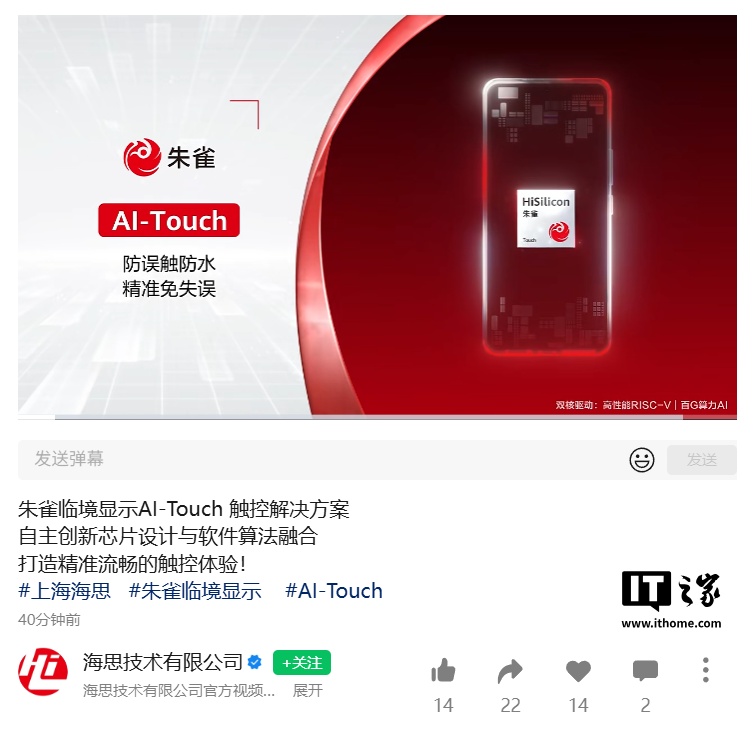 7 月 31 日消息,海思技术有限公司今日发文,上海海思朱雀临境显示推出 AI-Touch 触控解决方案,它专为手机触控量身打造。“它具备防误触防水、又准又快、强抗干扰的卓越性能,让你告别手机裤兜误拨、水珠乱触、雨天操作失灵等烦恼。”