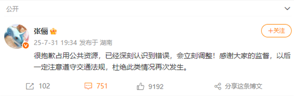 7月31日晚,张俪在其个人微博就疑似遮挡机动车号牌一事发文致歉:“很抱歉占用公共资源,已经深刻认识到错误,会立刻调整!感谢大家的监督,以后一定注意遵守交通法规,杜绝此类情况再次发生。 ”