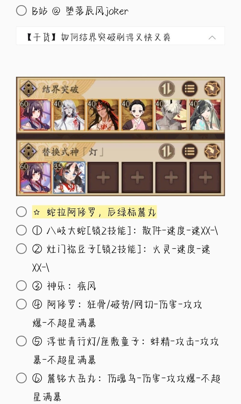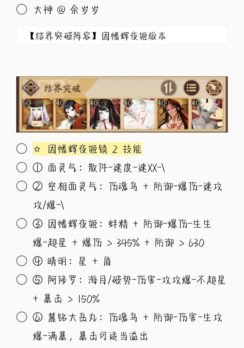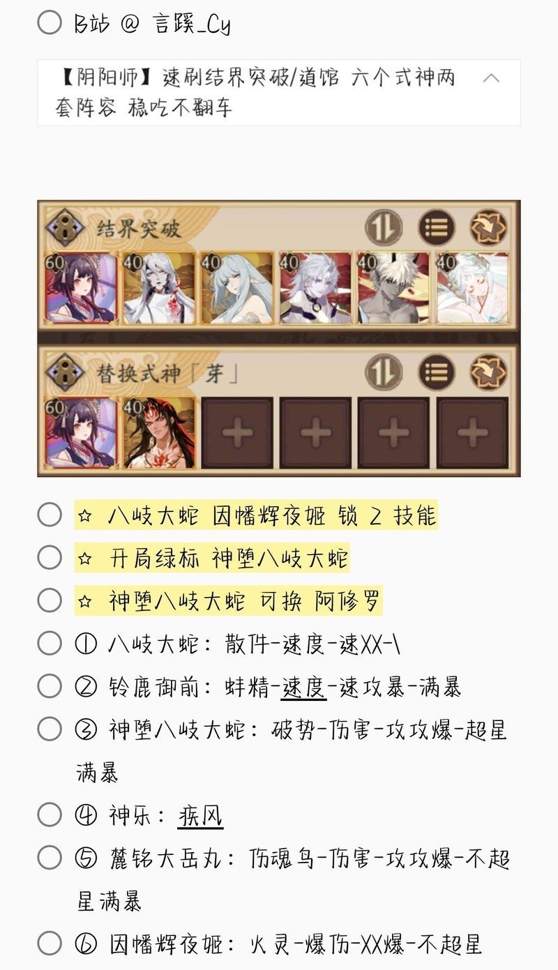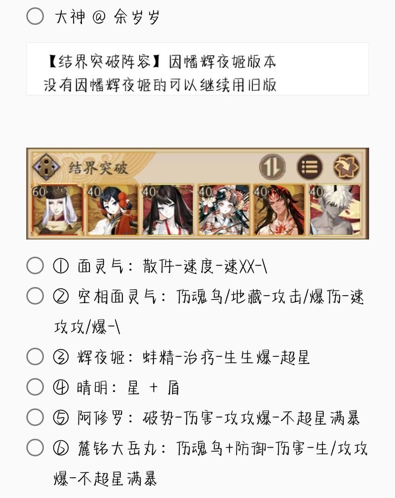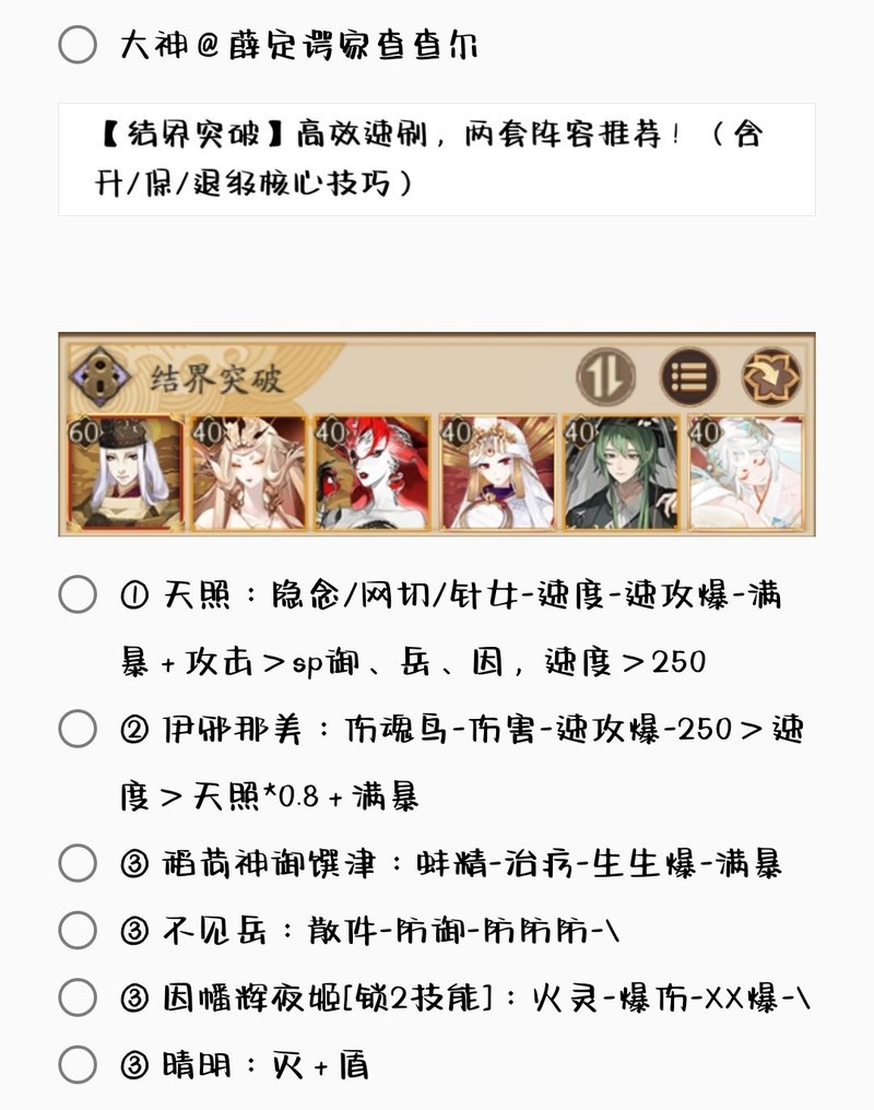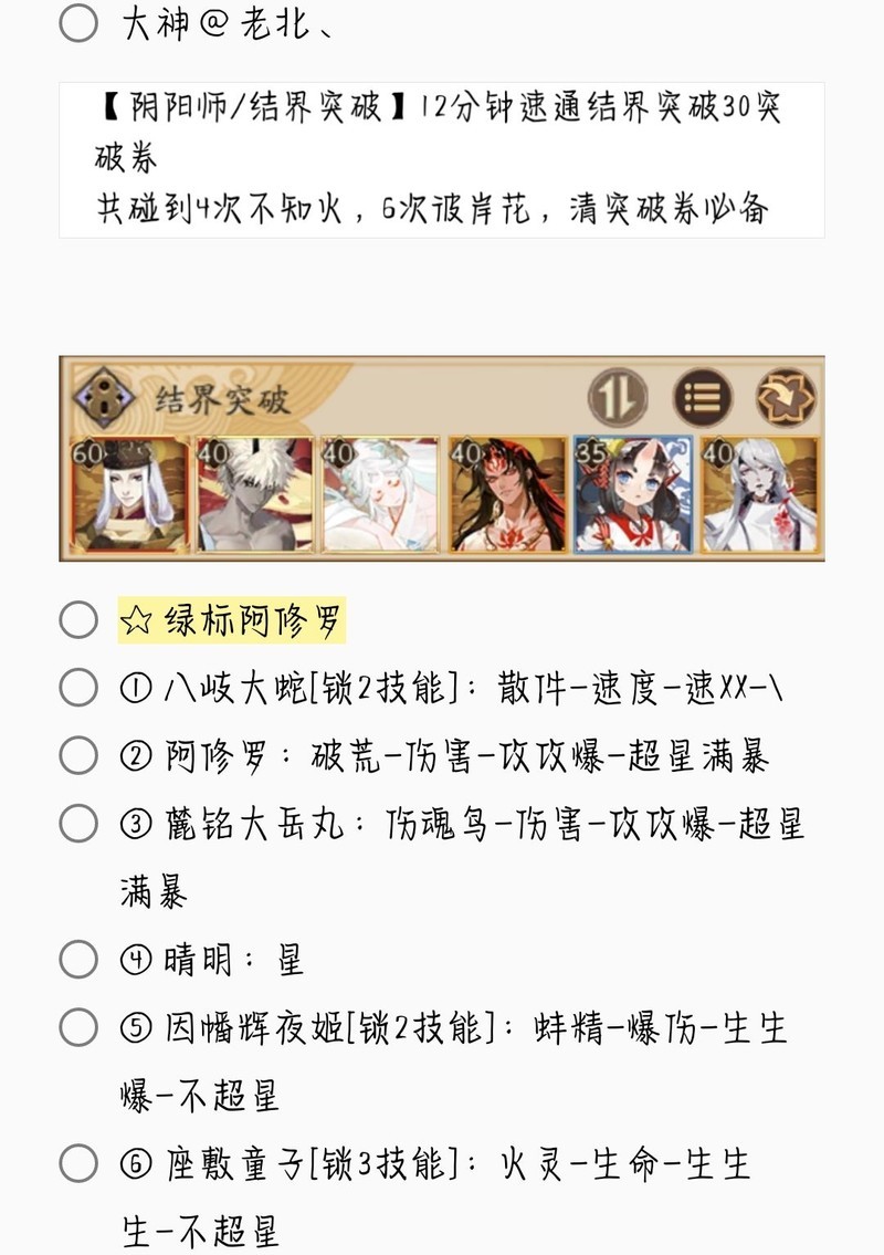 若无特别说明,阵容中的式神需达到六星并技能点满。