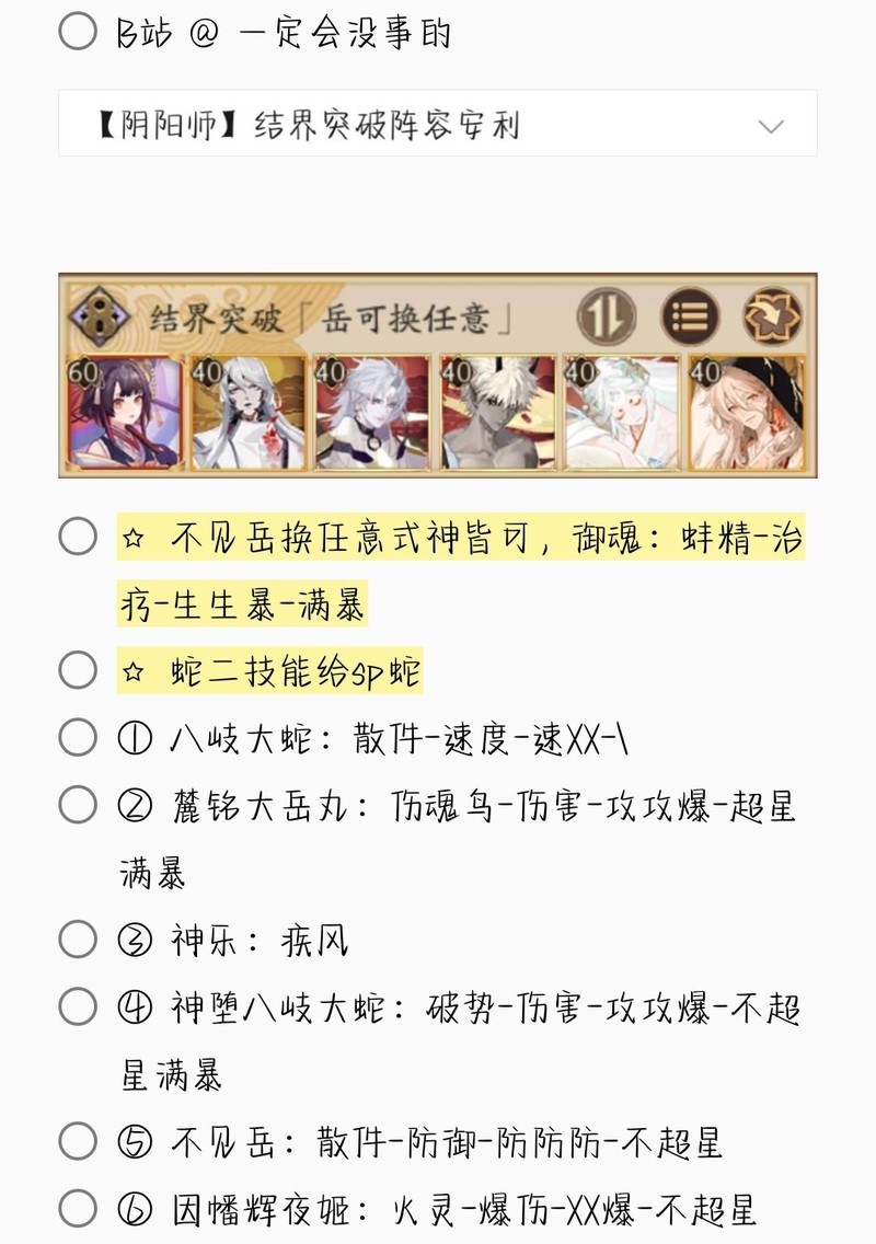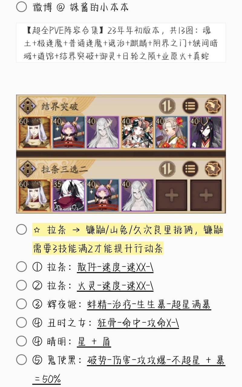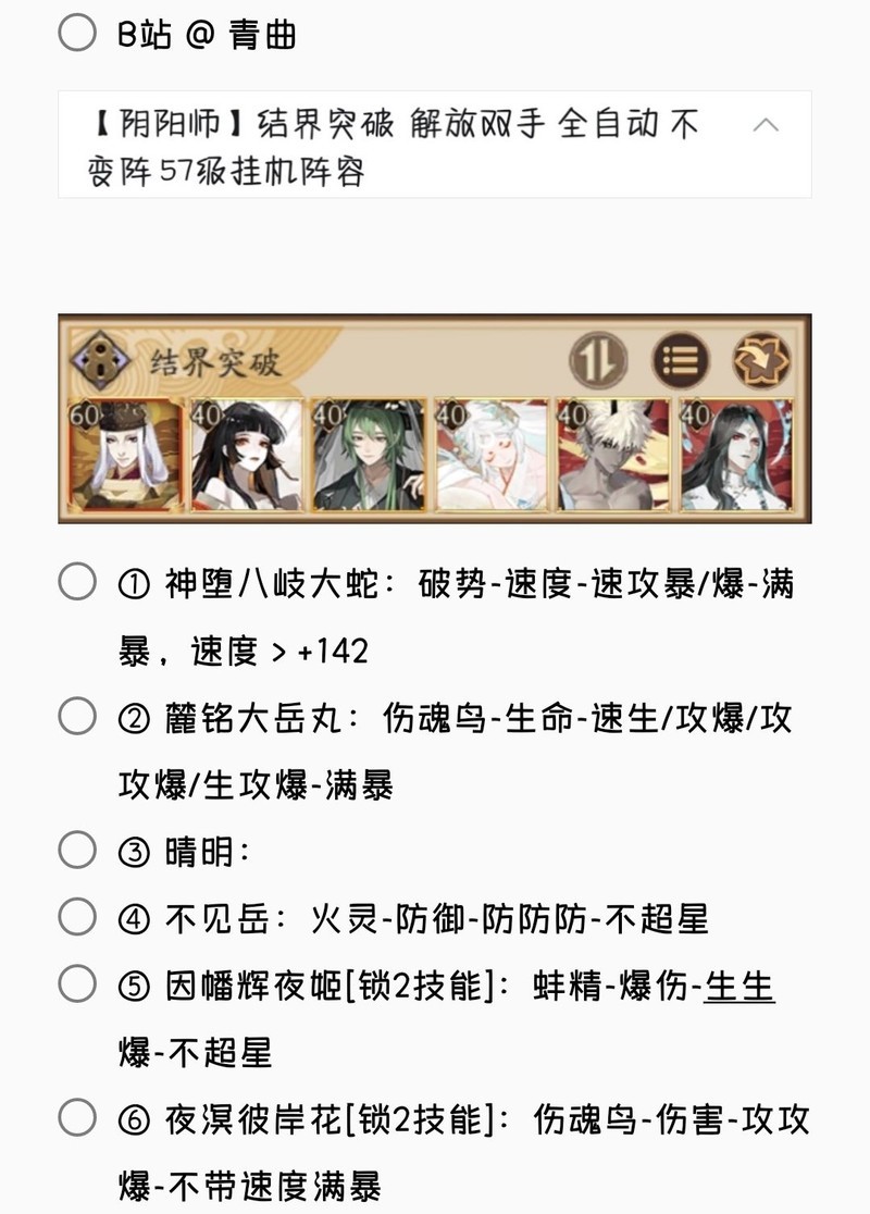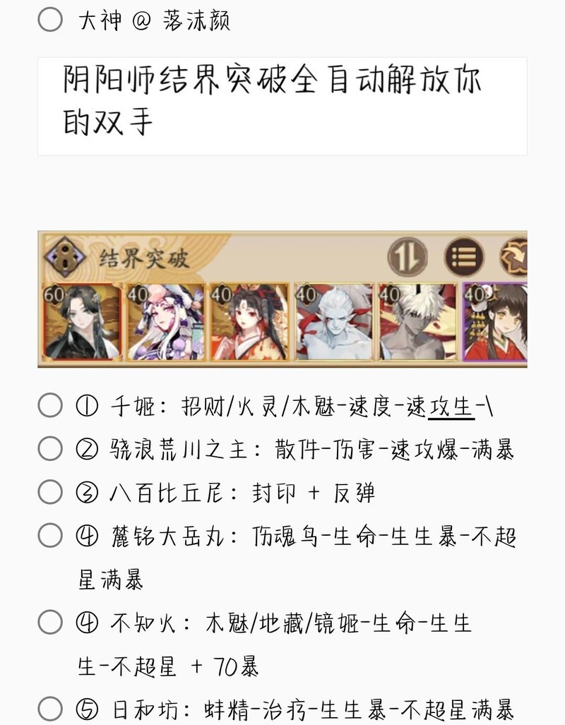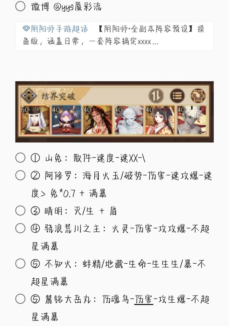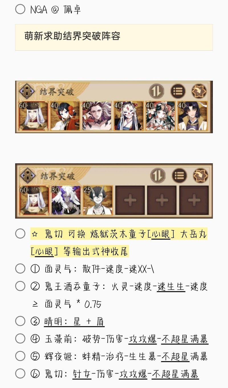 若无特别说明,阵容中的式神需达到六星并技能点满。