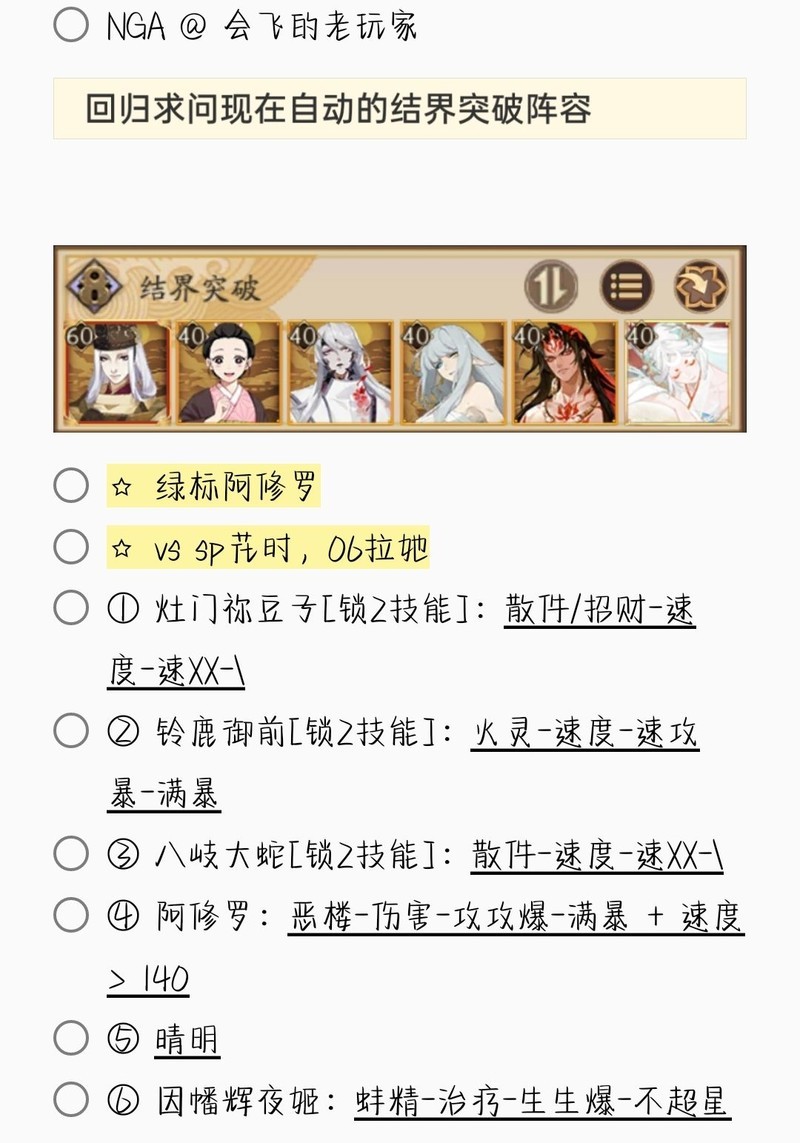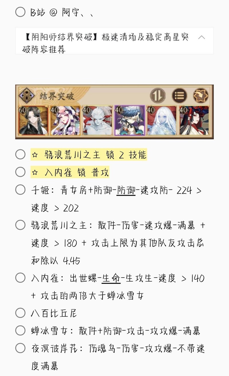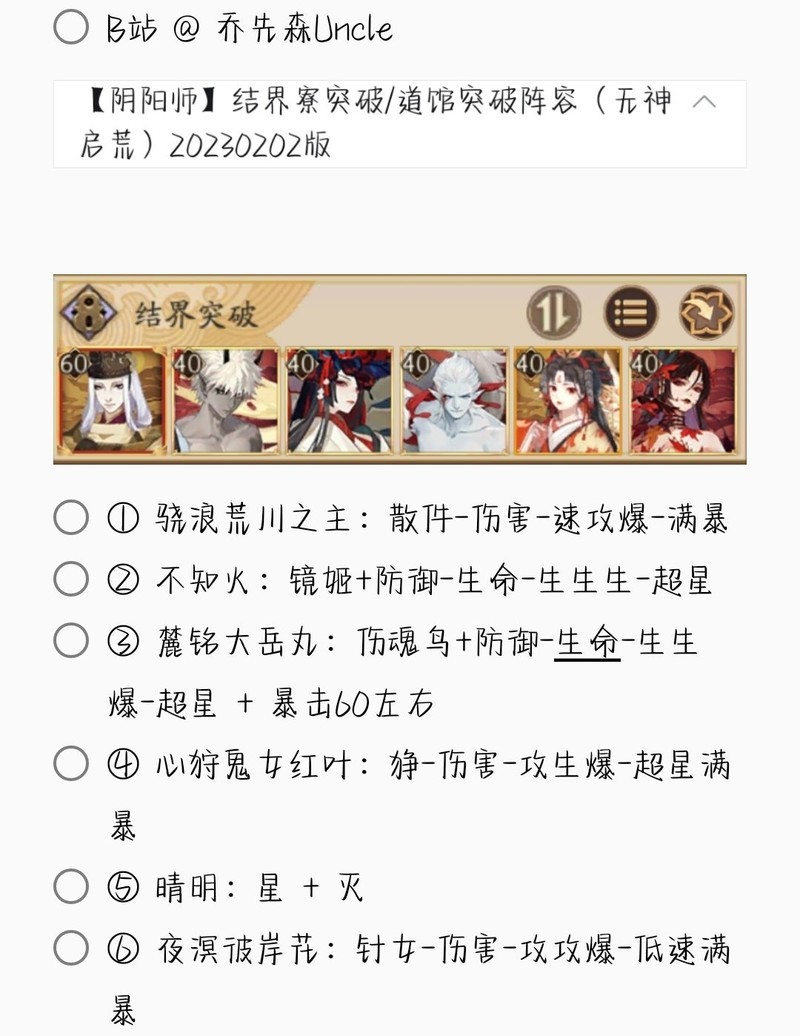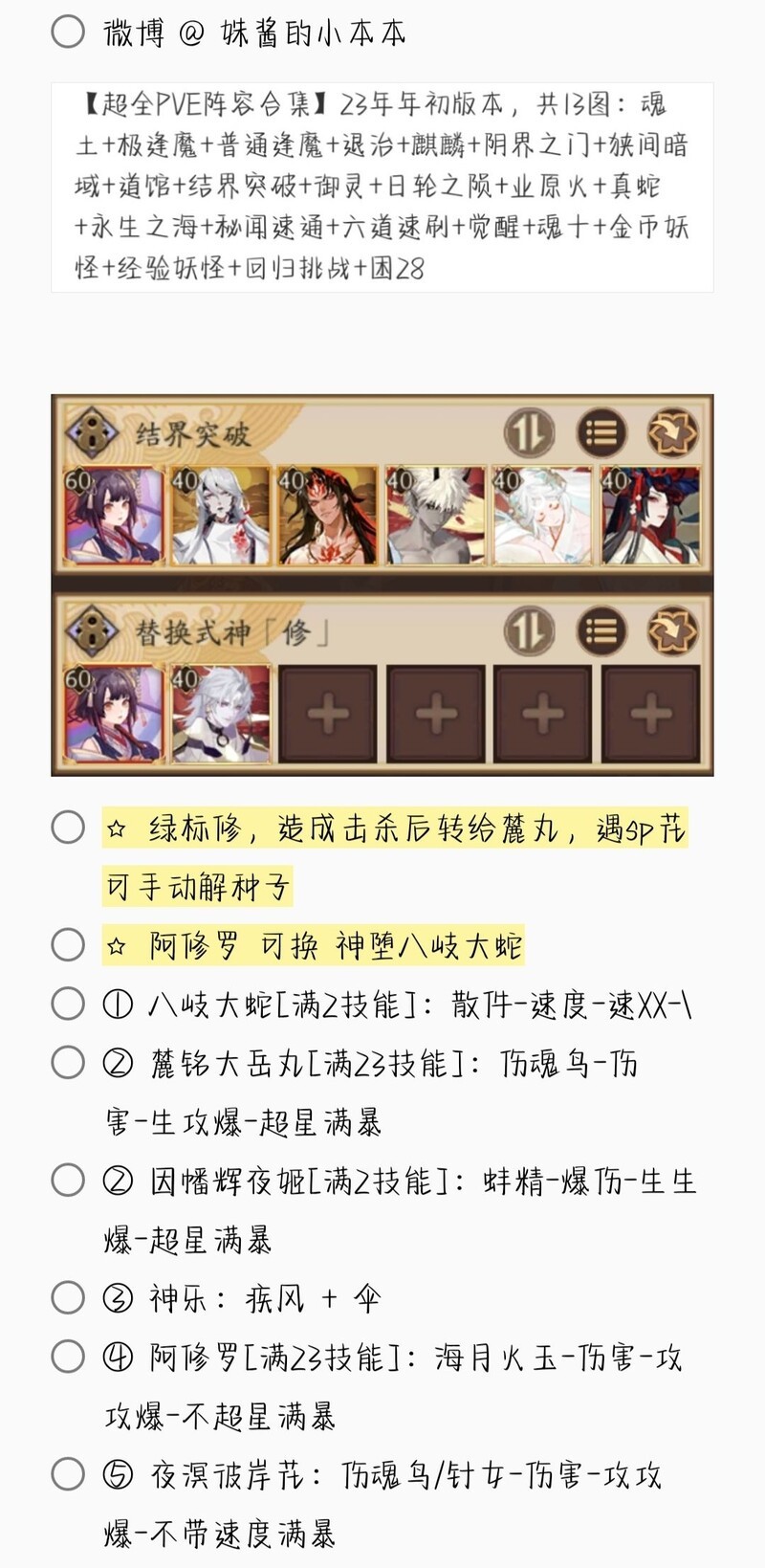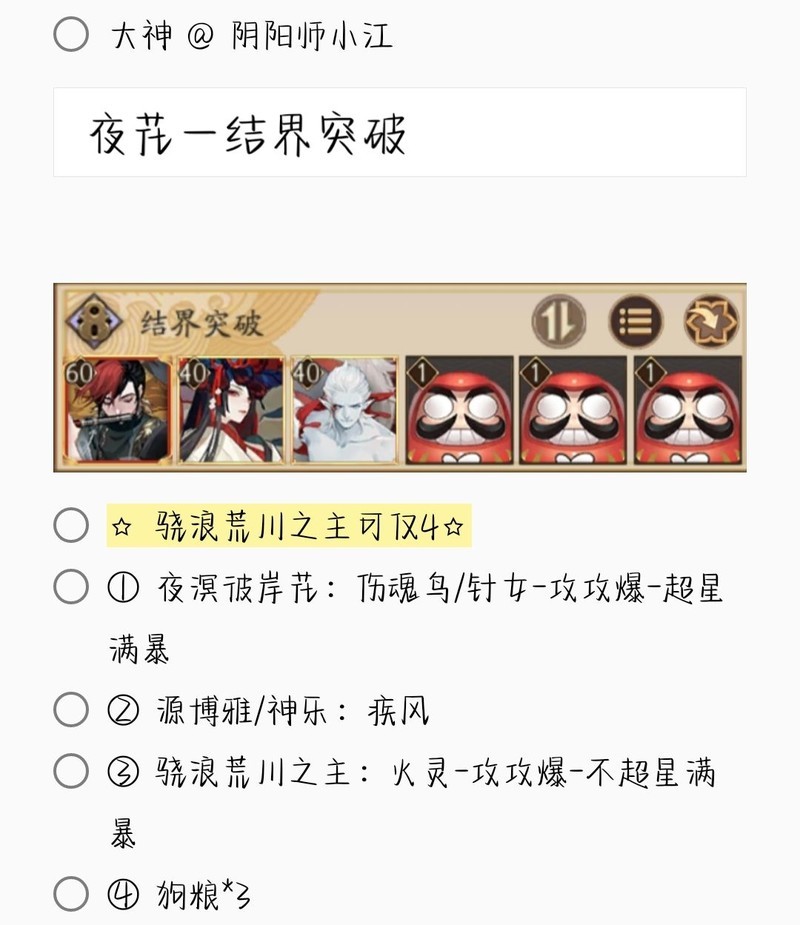 若无特别说明,阵容中的式神需达到六星并技能点满。