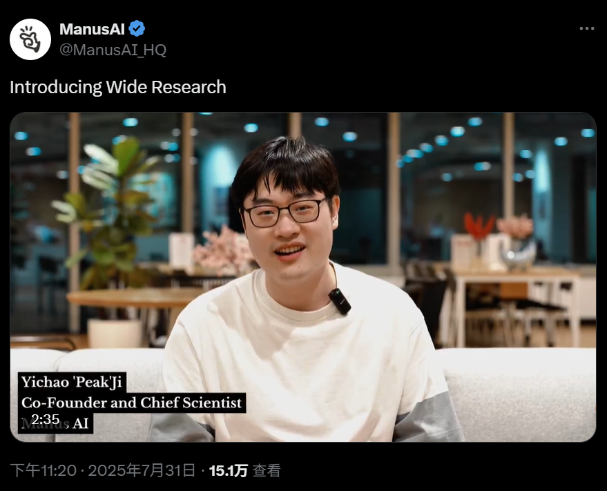 在官方 X 账户上发布的视频中,Manus 联合创始人兼首席科学家季逸超演示了使用 Wide Research 比较 100 款运动鞋的效果。