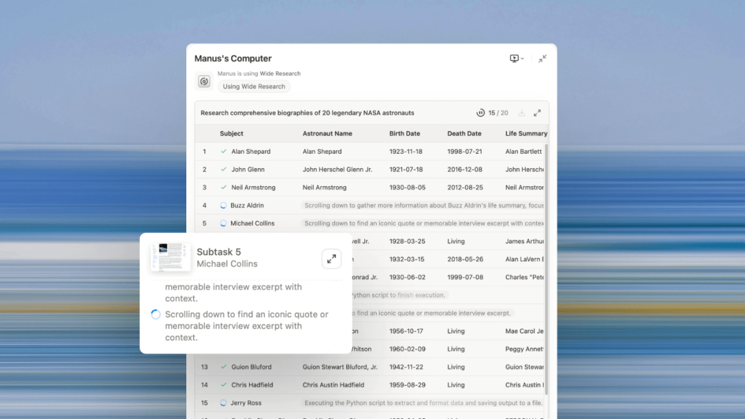 通过 Wide Research,人们可以使用 Manus 委托数十个甚至数百个子智能体进行研究或创造性探索。与具有预定义角色(例如经理、程序员或设计师)的传统多智能体系统不同,Wide Research 中的每个子智能体都是功能齐全的 Manus 实例,没有对任务进行定制化,可以独立运行并承担任何通用任务。