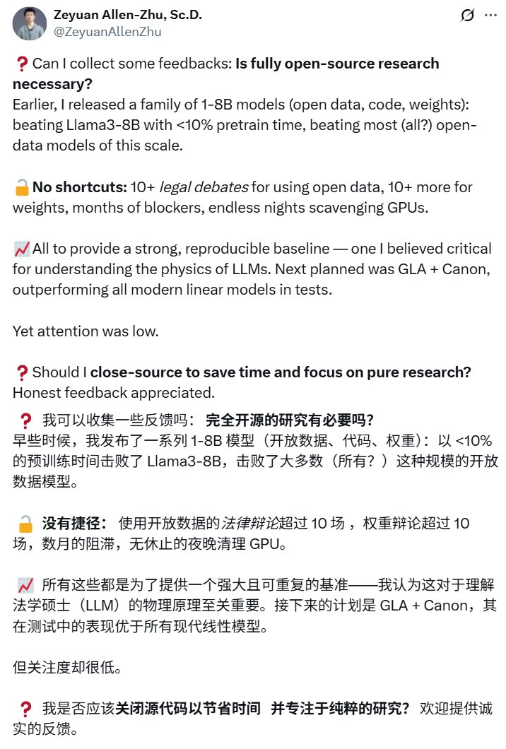 然而,该项目开源发布一段时间,朱泽园却疑惑地发现项目关注度不高。这让他不禁发出了痛心一问:「完全开源的研究真有必要吗?」他还问道:「我是否应该选择闭源以节省时间并专注于纯粹的研究?」