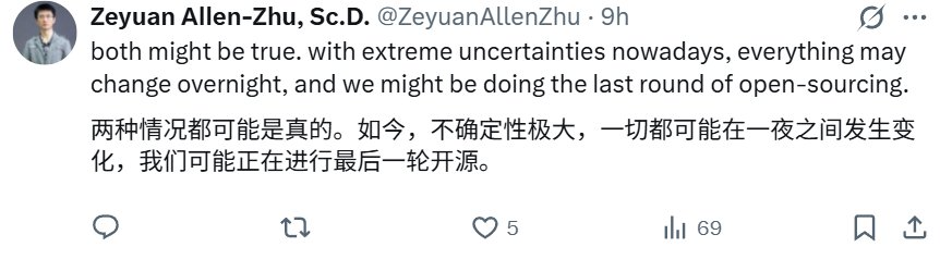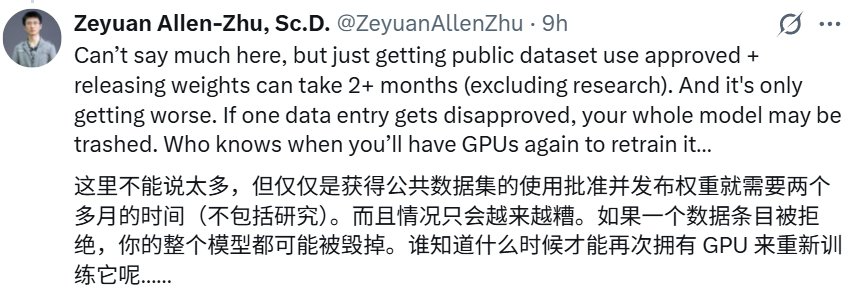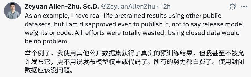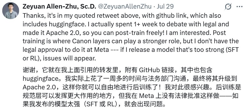 他还提到,光是为了让 Physics of Language Models 这个项目以 Apache 2.0 协议开源,他就与 Meta 的法务部门沟通了超过一周。如果发布的模型过于强大,还会出更多问题。