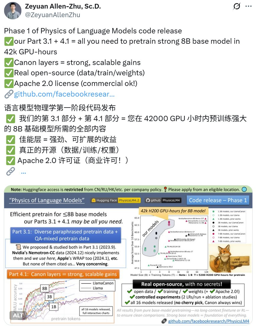 朱泽园在 7 月 27 日发布了 Physics of Language Models 项目的第一阶段代码,其中包含了「在 42k GPU 小时内预训练强大 8B 基础模型所需的全部内容」,包括数据、训练代码和模型权重,可以说是真正的开源。并且「可以用不超过 10% 的训练资源打败 Llama3-8B」