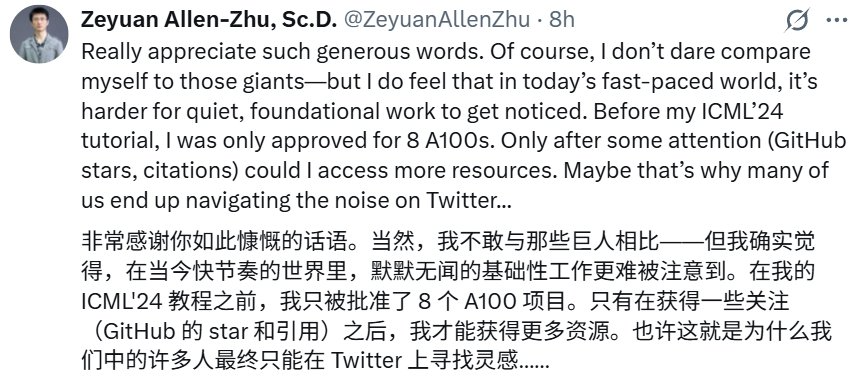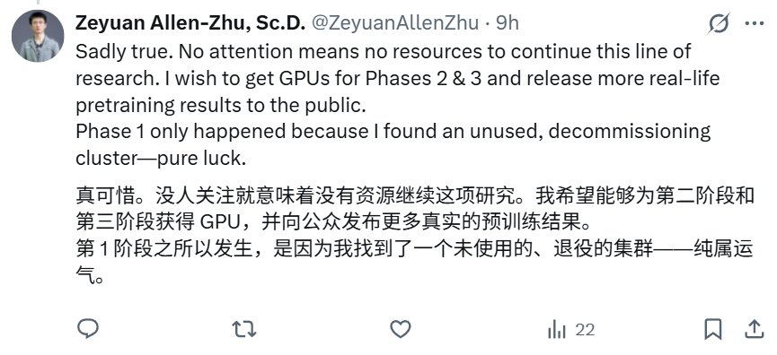 另外,朱泽园自己也指出了关注度可能与研究资源挂钩的现实,而这就不得不迫使研究者在 X 上场搞宣传,而他也正需要为这项研究的第二、三阶段争取到 GPU。
