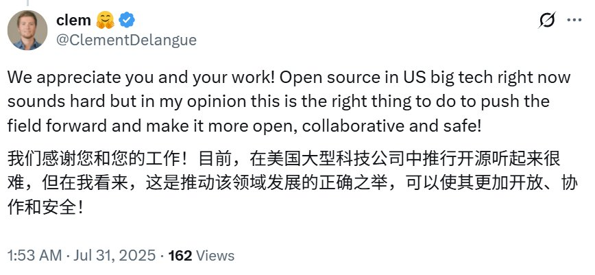 比如 Hugging Face CEO Clement Delangue 表示开源是推动 AI 领域发展的正确做法,可以使其更加开放、协作和安全!