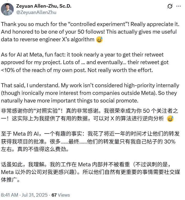 就在扎克伯格《个人超级智能》公开信发布几小时后,Meta FAIR 研究科学家朱泽园在一篇回复推文中无奈地表示:让 AI at Meta(@AIatMeta)这个 X 账号转发一下他的研究非常困难 ——「我花了近一年时间才让他们批准转推我的项目」;但「转推带来的触达量还不到他自己推文的 10%。」