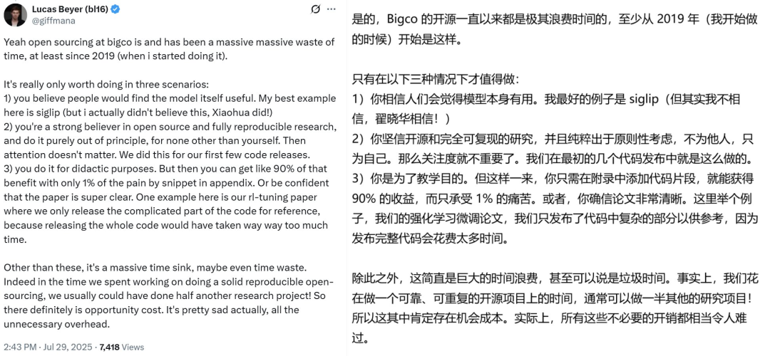 当然,也有人表示某些开源确实浪费时间,比如前段时间被 Meta 挖走的前 OpenAI 和 DeepMind 研究者 Lucas Beyer 表示 bigco 项目的开源就浪费了很多时间,不过他也指出了值得开源的三种情况。