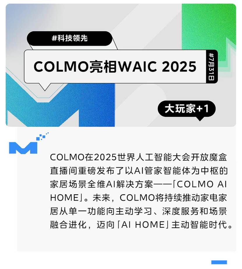 7月26日-29日,2025世界人工智能大会(WAIC 2025)在上海世博展览馆盛大举行。在这场汇聚全球顶尖人工智能技术与创新成果的重要舞台,AI科技家电COLMO,携家居领域AI全维解决方案「COLMO AI HOME」,与全球800余家顶尖科技品牌对话,并以家居领域首个实现应用的 AI Agent 智能体的精彩呈现,展示了品牌引领智能家居迈向主动智能的技术思考。