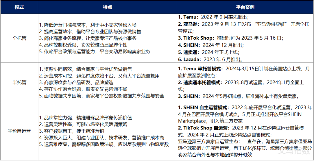 从平台运营模式来看,跨境电商可分为商家自主运营模式、半托管模式、全托管模式。