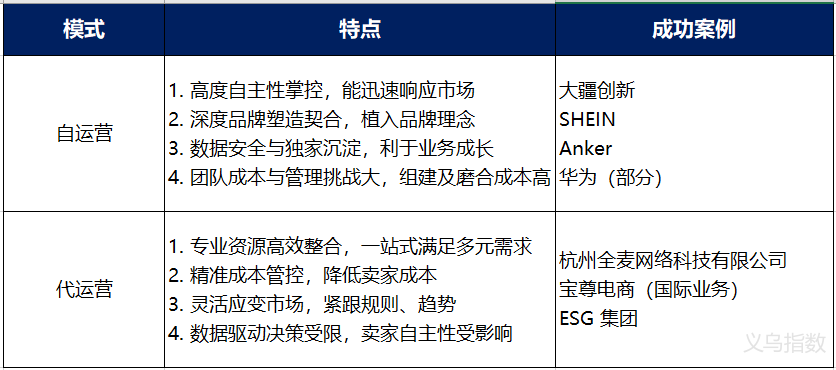 自运营靠商家内部团队把控全程,近年市场份额渐升,在营收、复购率等维度表现亮眼,具高度自主性、利于品牌塑造等特点,大疆、SHEIN等是成功范例;代运营是卖家外包部分或全部关键职能给第三方,市场规模增长迅猛,认可度高,有资源整合高效、成本管控精准等优势,全麦网络、宝尊电商等助力企业成功出海。