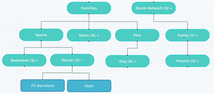 图丨语义记忆树结构示例。在本示例中,用户使用的语义记忆用于存储新概念及其关系,其采用多级分类结构,例如社交网络和收藏夹。在收藏夹中,记忆进一步细分为更具体的类别,包括体育、宠物和音乐(来源:arXiv)