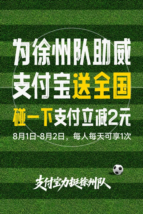 而作为徐州队主赞助商的支付宝,早已备好超强应援福利——8月1日至8月2日,全国用户使用“碰一下支付”功能,即可享受每笔立减2元的优惠,每人每天可参与1次。