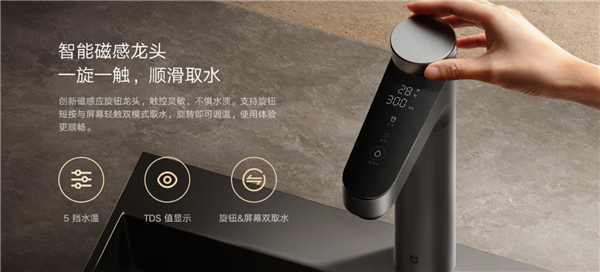 在使用便捷性方面,智能磁感龙头支持旋钮调温和屏幕触控操作,搭配米家APP,用户可以实时监测水质、用水量及滤芯状态,轻松掌握净水器的运行情况。