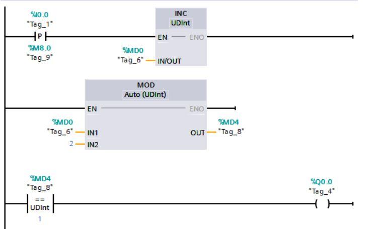 CV初始值为0,按钮按一下CV变为1,Q0.0得电,再按一下CV变为2,Q输出使得计数器复位,CV立即变为0。本质是利用计数器的自循环。