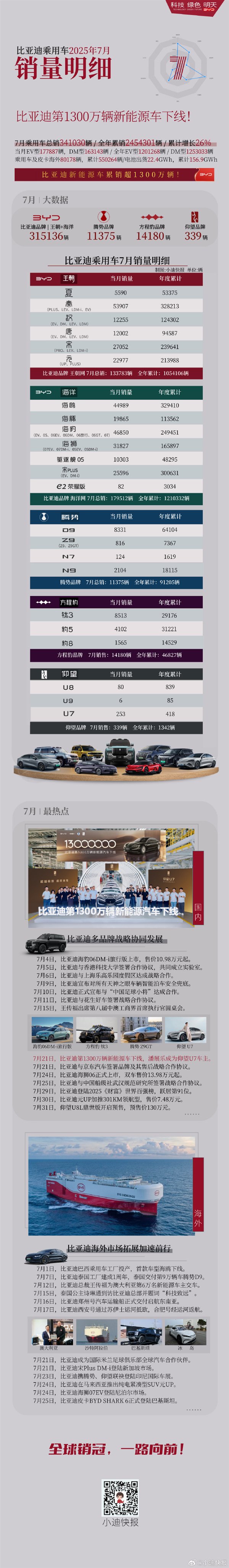 快科技8月1日消息,比亚迪今晚公布了7月汽车销量,总销量达344296辆,新能源车累销超1300万辆。