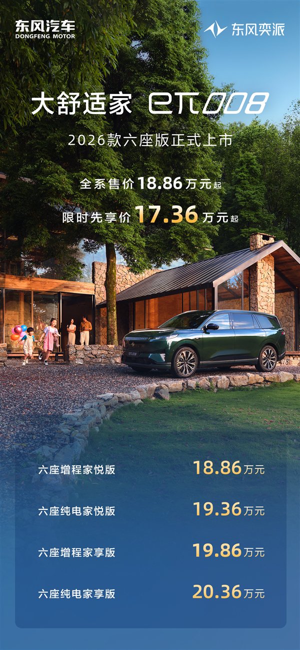 快科技8月2日消息,昨晚,东风奕派科技旗下2026款eπ008六座版正式上市,限时售价17.36-19.06万元,此次改款新车进行了多项升级,官方宣称多达108多项。