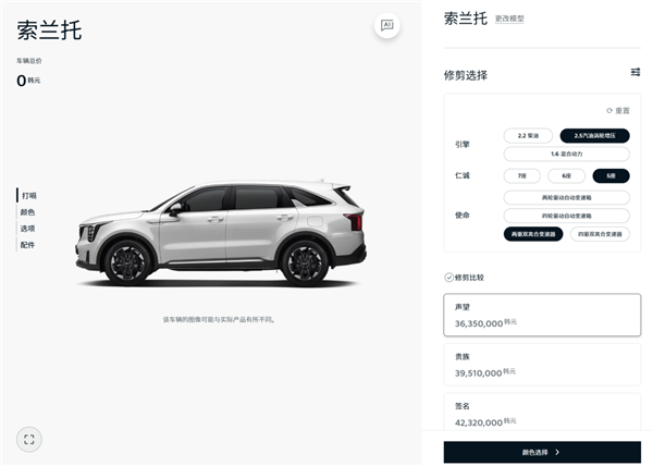 大科雷傲混动版本的其售价是 3760.9 万韩元 ( 约 19.5 万 RMB ),和国内价格比,贵了不到 4 万。但竞品索兰托的混动则要 4058 万(约 21 万 RMB)。