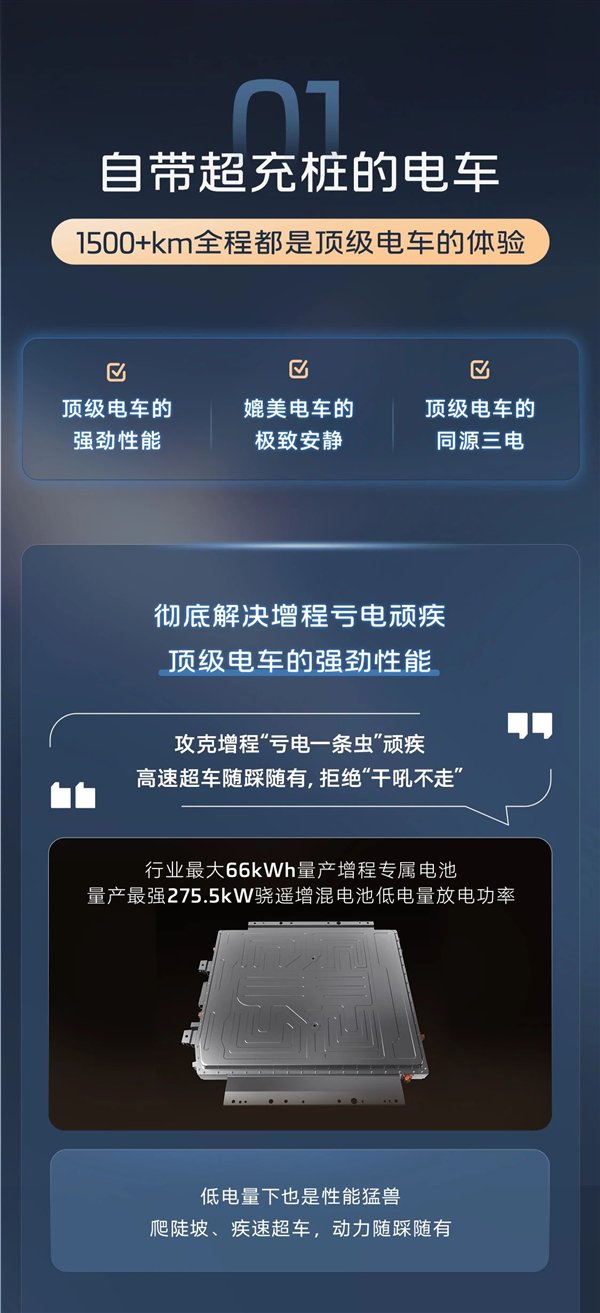 该系统由1.5T发动机与电动机组合而成,并搭配66kWh电池组,纯电续航超过450公里,综合续航超过1500公里!