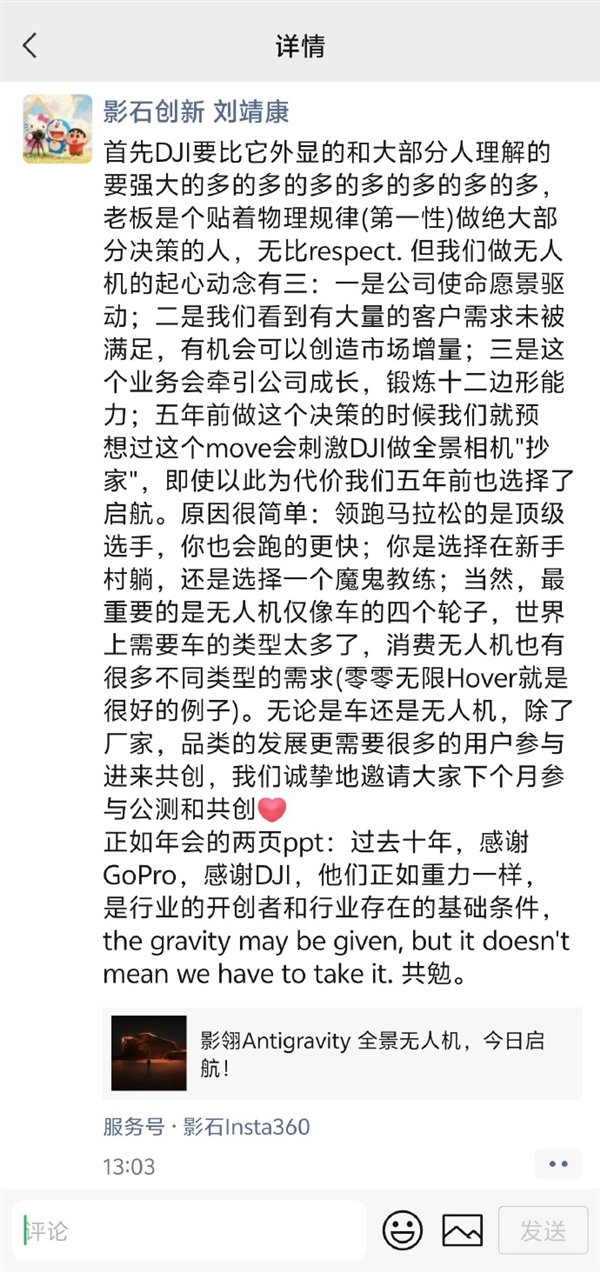 对于进军无人机领域,刘靖康曾发布朋友圈标识做无人机的起心动念有三个,并称无比尊重大疆。