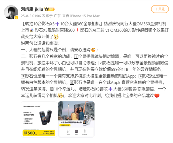 此外,影石CEO刘靖康还专门发布了一条微博,热烈庆祝同行大疆OM360全景相机上市。