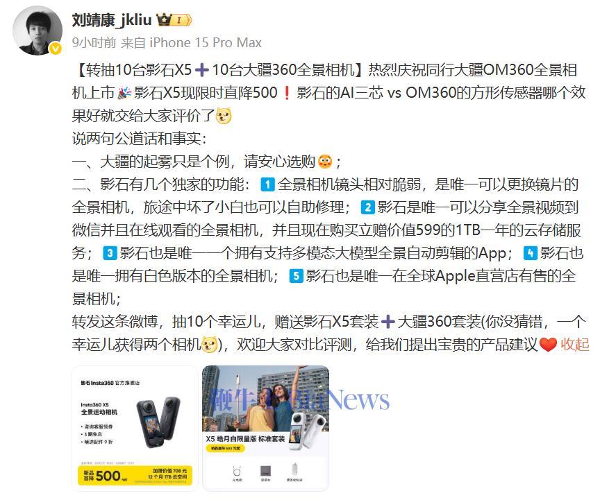 对此,影石CEO刘靖康今天凌晨发文:“热烈庆祝同行大疆OM360全景相机上市”。