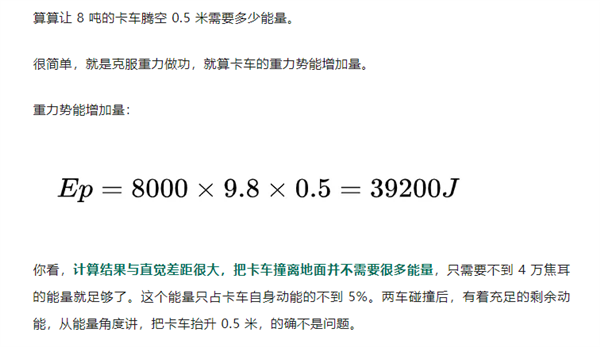 经计算,让8吨卡车腾空0.5米仅需约39200J能量,不到卡车自身动能的5%,剩余动能足以实现。