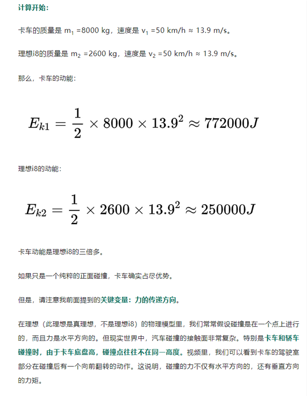 计算可知,卡车动能约720000J,是理想i8(约250000J)的三倍多,若纯粹正面碰撞,卡车更占优势。