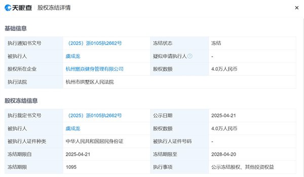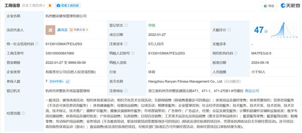 天眼查显示,涉事健身房所在的公司名为杭州燃焱健身管理有限公司,法定代表人叫虞成龙,成立日期是2022年1月份,注册资本是5万元人民币。