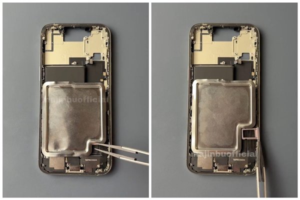如图所示,iPhone 17 Pro采用L型电池,电池外表使用钢制外壳,以此来提高散热效率。