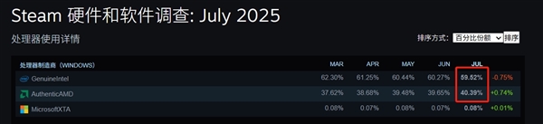 2025年7月最新的Steam硬件调查数据显示,AMD在游戏CPU市场的份额首次突破了40%,创下历史新高。