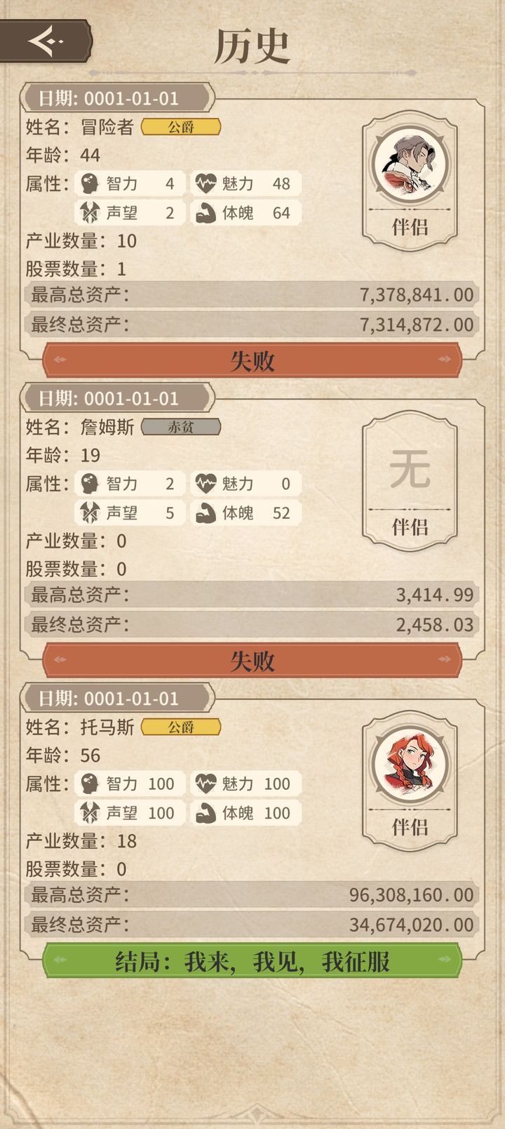 一开始选择拥有千万地产的武军,无需准备,因为准备也没用,是程序漏洞。赚到钱后把左下角属性点满,身份就能升为公爵。后续选项需要一千万资金,直接点跳过直到结局即可。这条路线核心就是不断赚钱、花钱。