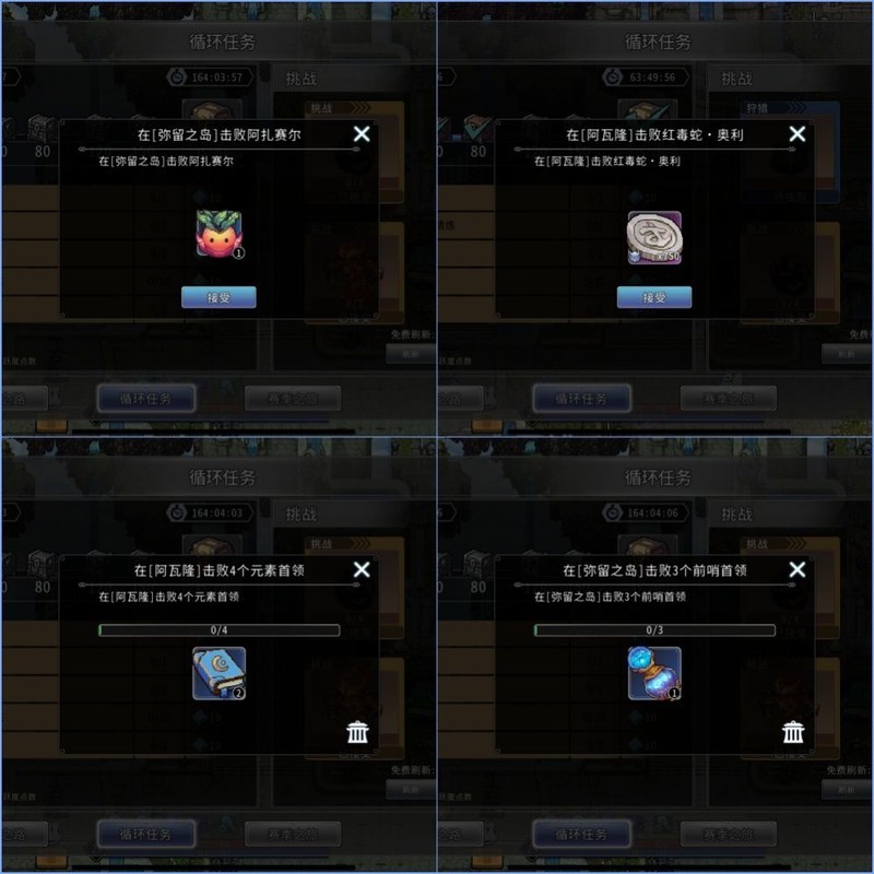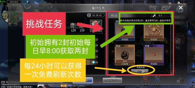 建议优先领取奖励为果实、专家级洞察之书、极限药水以及银币的挑战任务(注意不要接取掉落果实的任务,前期难度较高,可考虑组队协助)。每次完成任务后,原位置会刷新新任务。若放弃任务也可刷新,但委托信将不予返还。