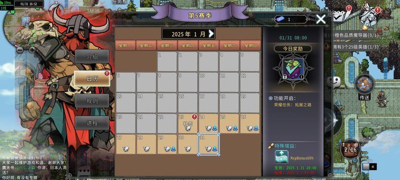日历支持签到功能,每日签到可领取丰富奖励,还能查看新功能上线时间和特殊加成信息。