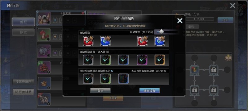 开启荣耀会员后,记得设置随行兽辅助功能,务必打开自动拾取和使用药水选项,建议将自动用药的阈值调至30-40,以免角色生命值过低导致死亡。