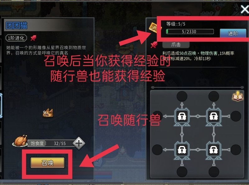 随行兽分为攻击型、增益型和属性型,效果随等级提升而增强。