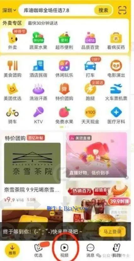 23年10月,美团调整了APP首页Tab栏的功能布局,将中间位置改为短视频功能的流量入口。