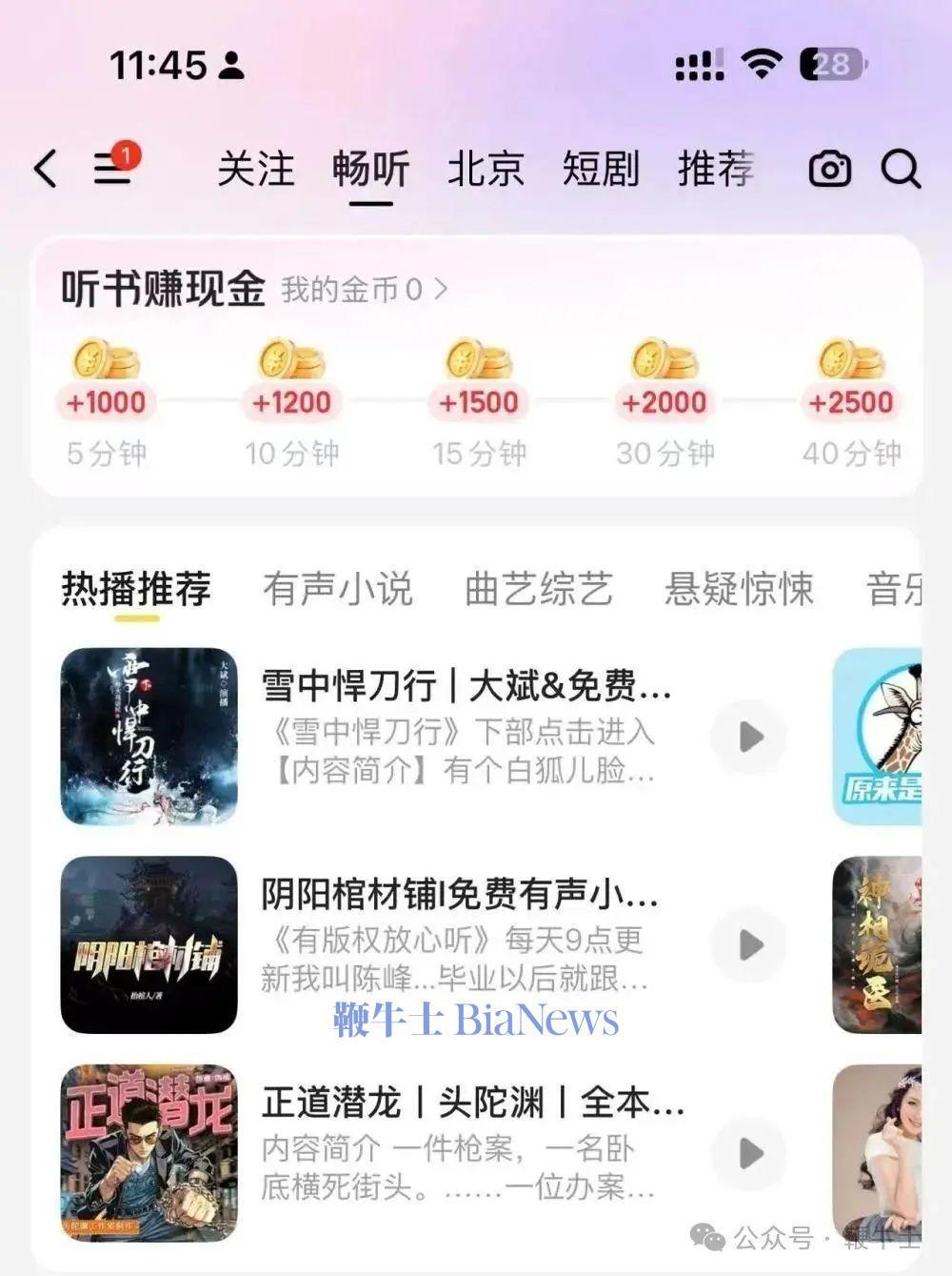 点开之后,该栏目分为几个板块,分别是关注、畅听、位置相关信息、短剧和推荐短视频。不论是畅听还是短剧或是其他内容,基本上免费收听或收看。