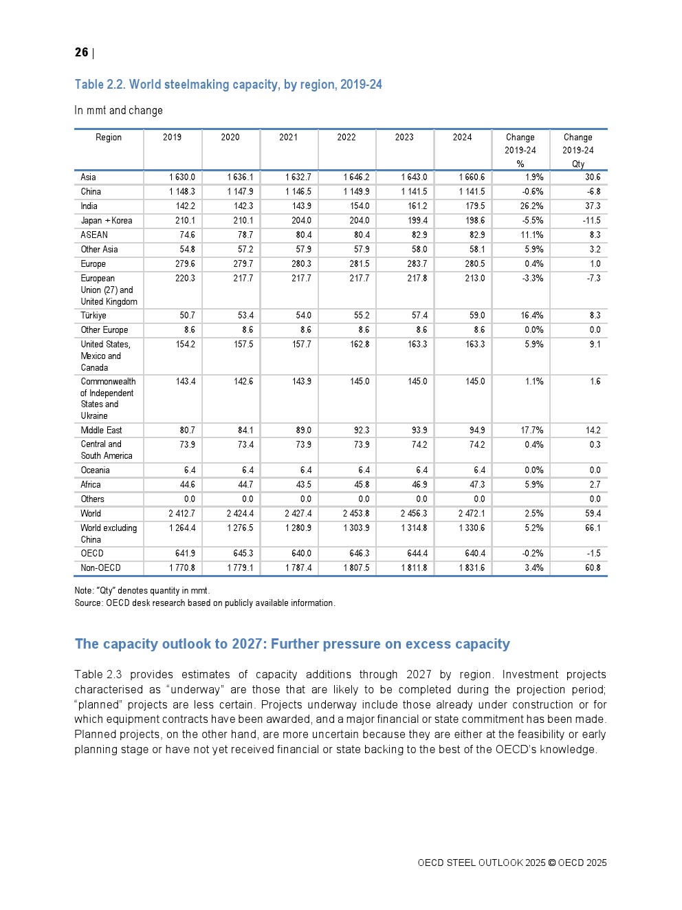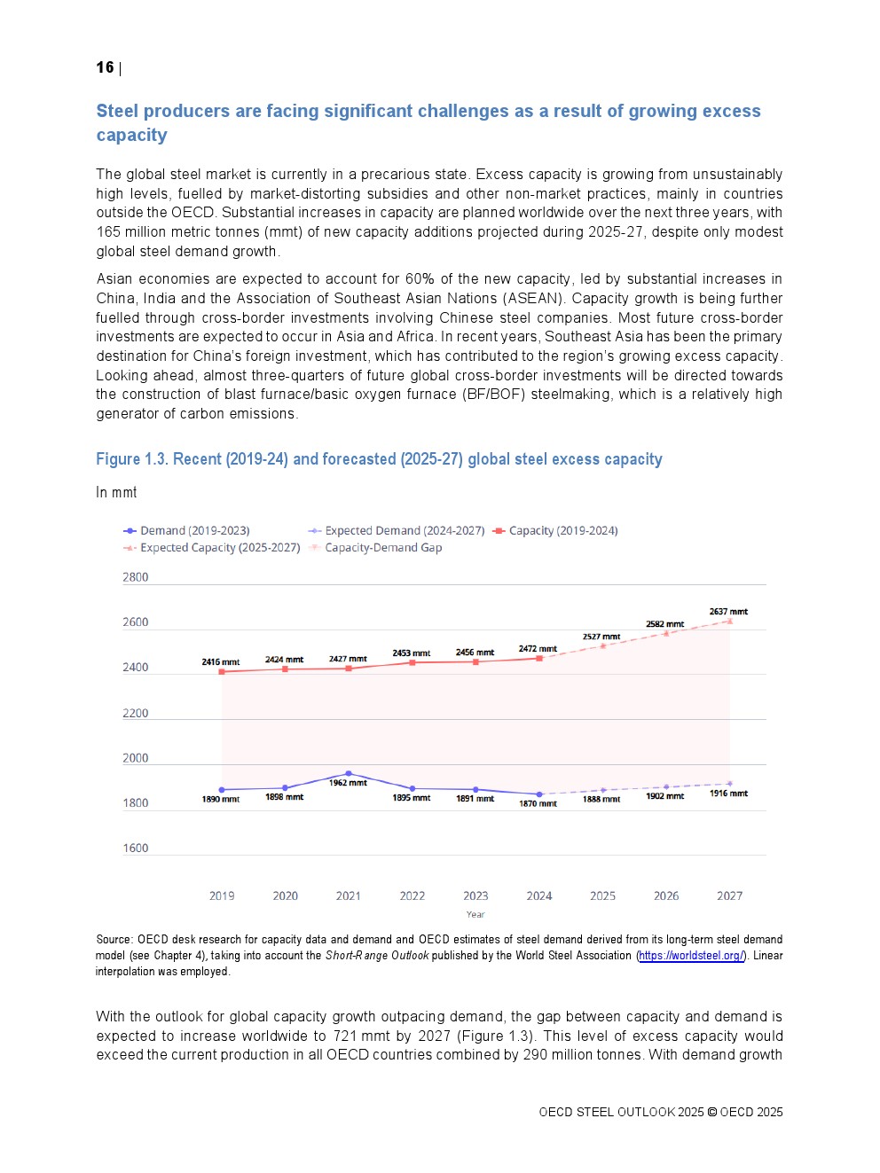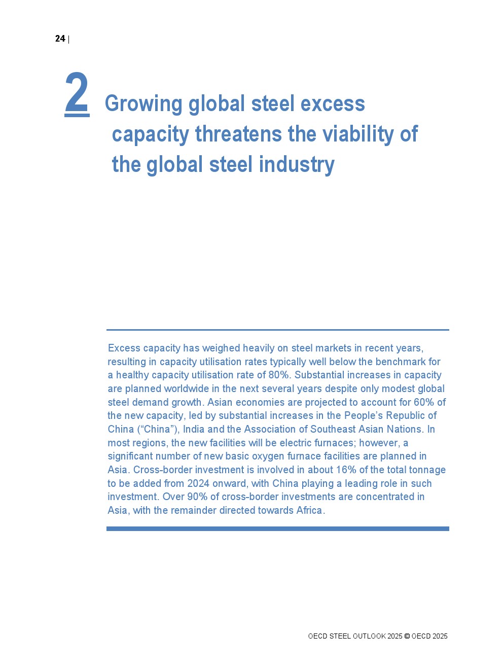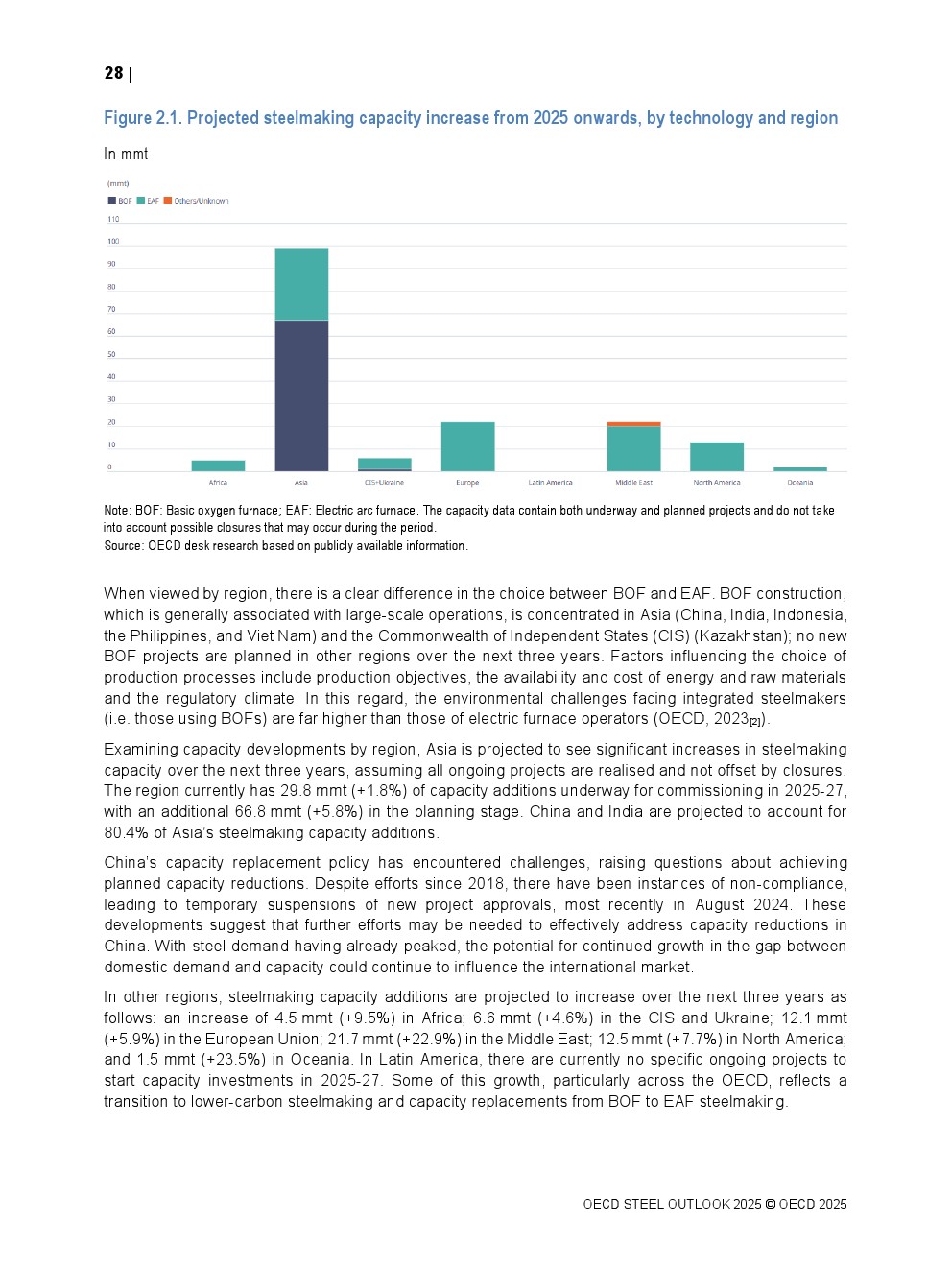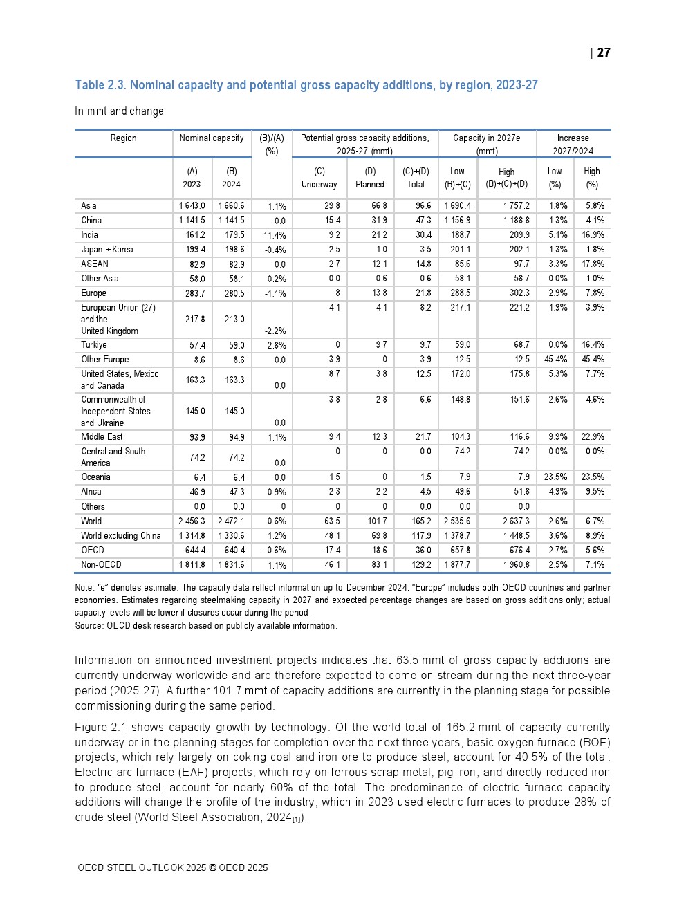 OECD发布了新报告“钢铁展望2025”。2025至2027年期间,全球计划大幅增加炼钢产能,增幅高达6.7%(1.65亿公吨),若实现将加剧全球产能过剩。预计亚洲经济体将占新增产能的58%,中国和印度的增幅最大。2025年起新增产能中约16%涉及跨境投资,中国在此类投资中发挥主导作用。