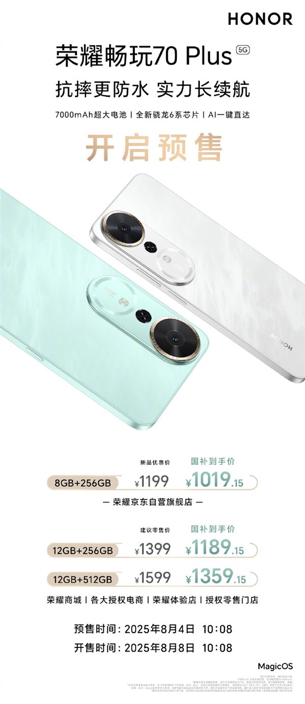 快科技8月4日消息,今日,荣耀畅玩70 Plus正式发布,国补到手价1019.15元起。
