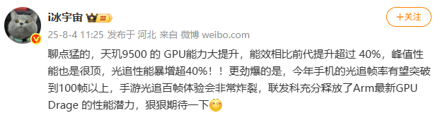 旗舰赛年提速开打!各大品牌消息蹭蹭冒,但决定胜负的依旧是芯片火力!据最新爆料,联发科天玑9500 这次直接把 GPU 能效拉高 40%+,峰值性能更是狂飙,光追性能也同步飙升 40%!发哥这波硬刚,就是要让手机游戏画质“卷”到无法呼吸,性能党是不是已经手痒了?