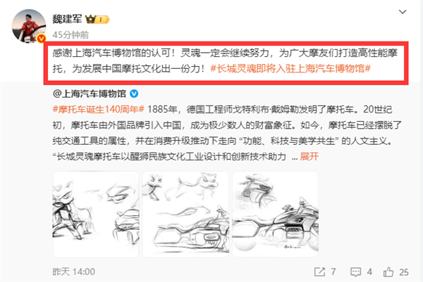 对此,长城汽车董事长魏建军转发微博并感谢上海汽车博物馆的认可。